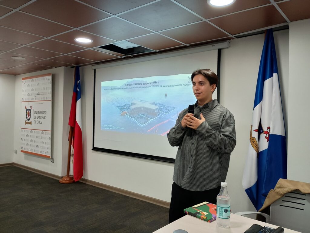 La jornada comenzó con un reconocimiento a los mejores trabajos desarrollados por egresados del máster durante 2025. En ese contexto, el arquitecto Bastián Pinto —distinguido con la mejor tesis  de su generación— presentó su proyecto de título “Infraestructura regenerativa: Pontón mitigador como solución basada en el sistema IMTA para la salmonicultura de Aysén”. Su exposición abordó una propuesta que integra criterios ambientales y productivos en territorios del sur de Chile, destacando el potencial del diseño arquitectónico en escenarios complejos.